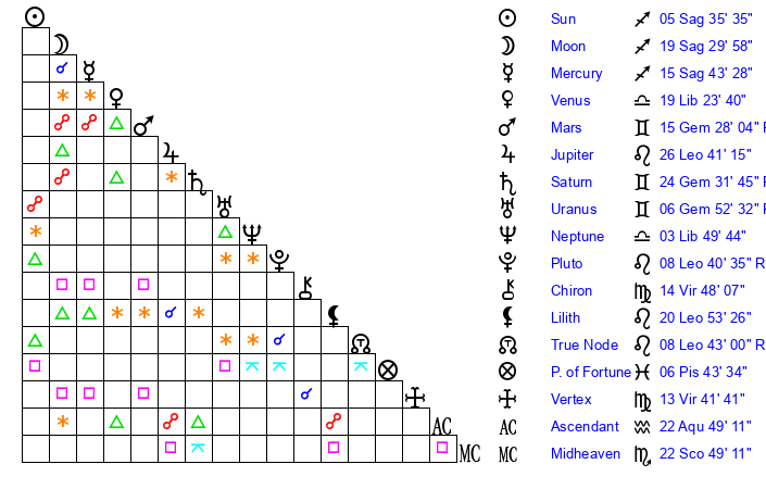 | Sun | 5 Sagittarius 36 | 6 Sagittarius 43 | 28 Aquarius 56 |