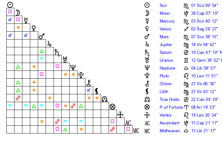 | Sun | 1 Scorpio 10 | 1 Scorpio 32 | 23 Capricorn 10 |