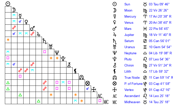 | Moon | 22 Virgo 22 | 6 Pisces 54 | 28 Leo 28 |