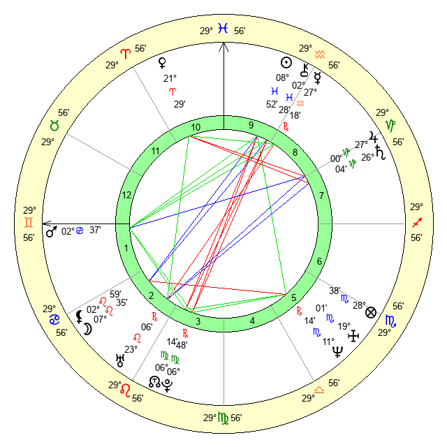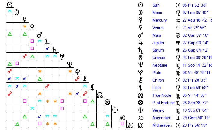 | Moon | 7 Leo 34 | 4 Pisces 55 | 6 Sagittarius 45 |