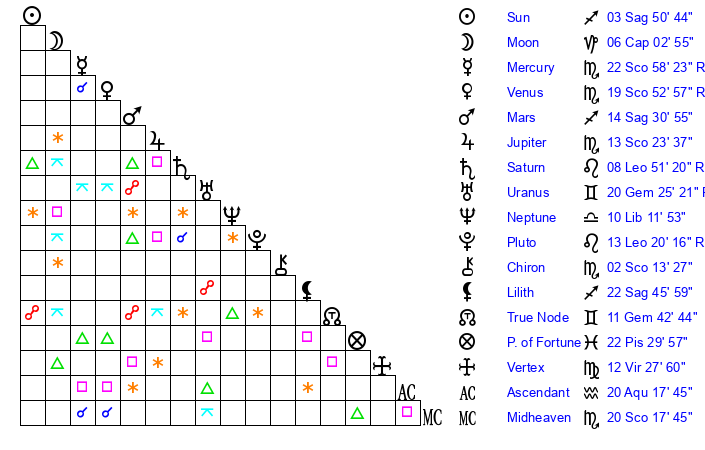 | Mercury | 22 Scorpio 58 | 21 Scorpio 33 | 9 Pisces 40 |
