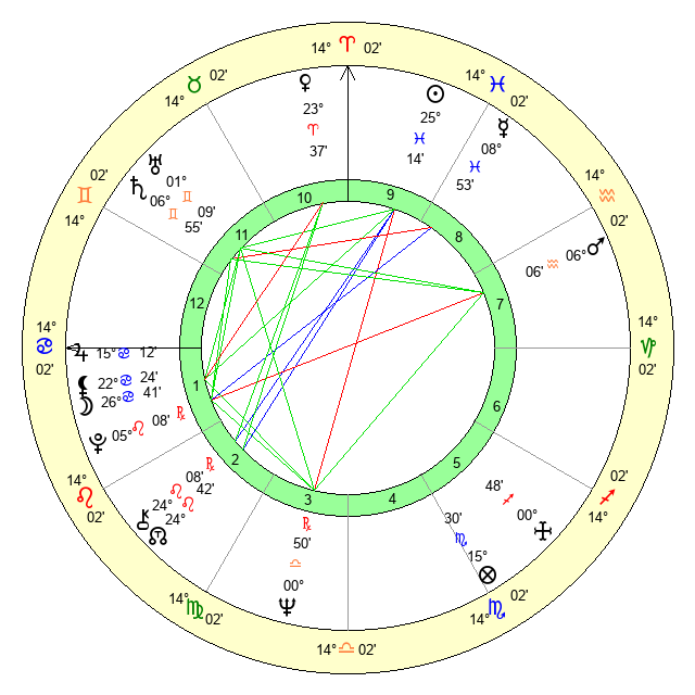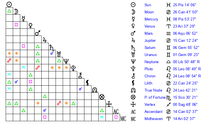 | Moon | 26 Cancer 40 | 22 Libra 44 | 26 Cancer 59 |