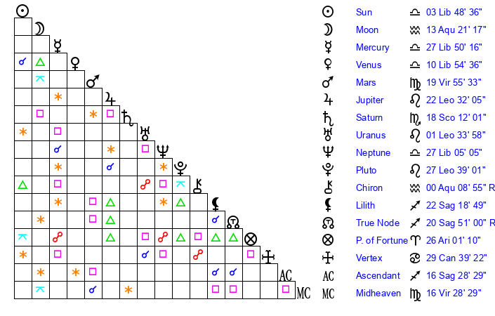 | Neptune | 27 Libra 5 | 0 Aries 37 | 29 Libra 33 |