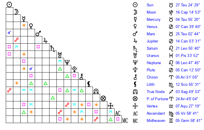 | Sun | 27 Taurus 24 | 28 Taurus 43 | 8 Virgo 55 |