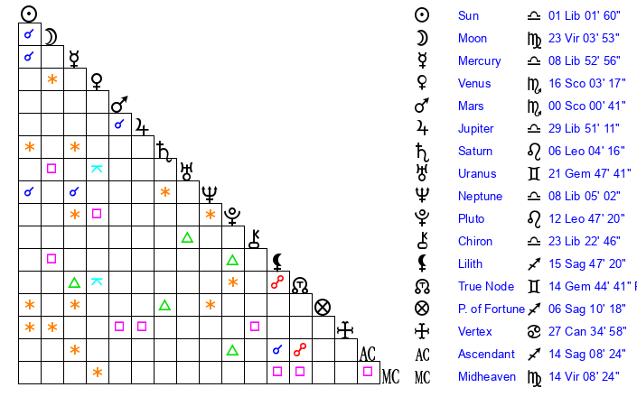 | Moon | 22 Virgo 58 | 3 Scorpio 59 | 15 Leo 5 |