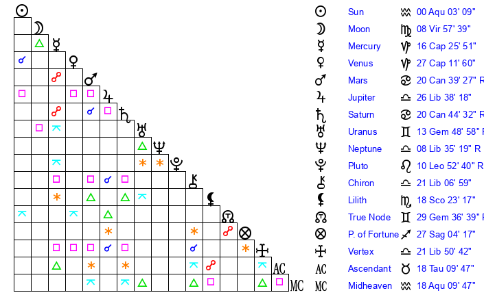 | Saturn | 21 Cancer 11 | 16 Pisces 11 | 18 Cancer 44 |