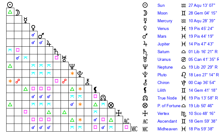 | Jupiter | 14 Pisces 41 | 11 Gemini 31 | 2 Aries 6 |