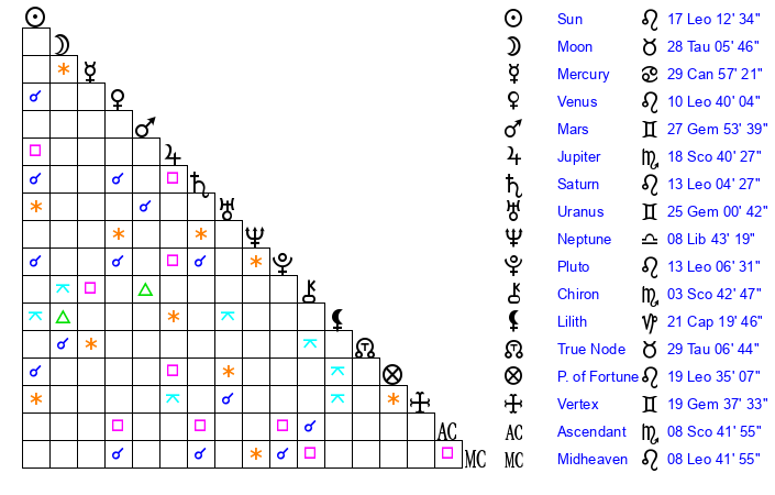 | Venus | 10 Leo 41 | 12 Cancer 17 | 17 Scorpio 38 |