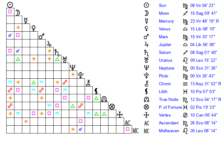 Pluto | 0 Virgo 26 | 1 Aquarius 45 | 2 Virgo 9 |