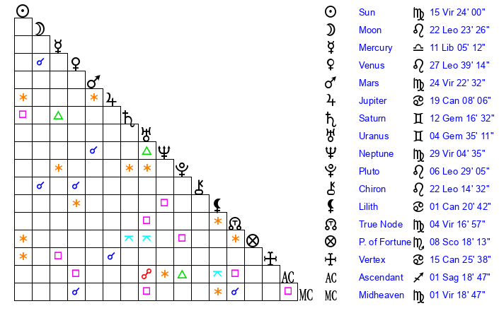| Sun | 15 Virgo 24 | 16 Virgo 18 | 7 Sagittarius 52 |