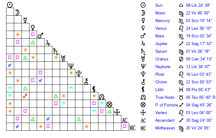| Moon | 22 Virgo 44 | 28 Capricorn 27 | 12 Cancer 42 |