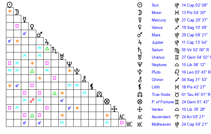 | Mercury | 27 Capricorn 21 | 4 Capricorn 21 | 12 Pisces 43 |