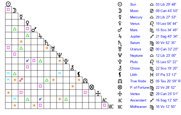 | Neptune | 12 Libra 23 | 0 Aries 39 | 14 Libra 50 |