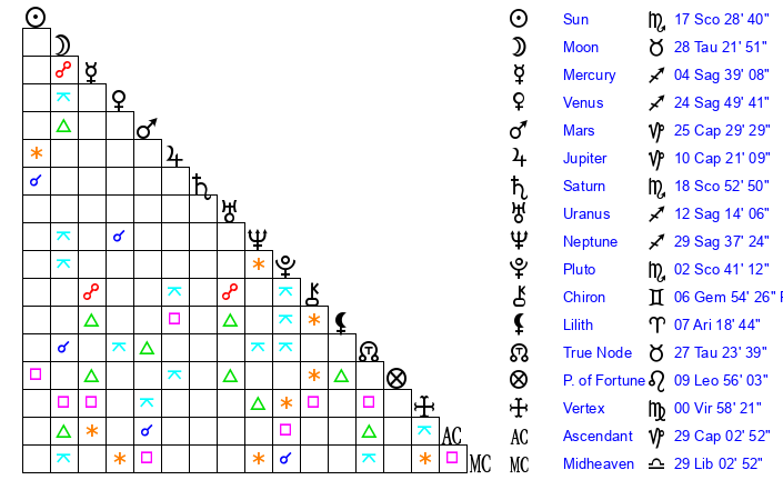 | Sun | 17 Scorpio 29 | 17 Scorpio 33 | 29 Sagittarius 1 |