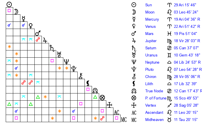 | Pluto | 7 Leo 54 | 3 Aquarius 45 | 9 Leo 9 |