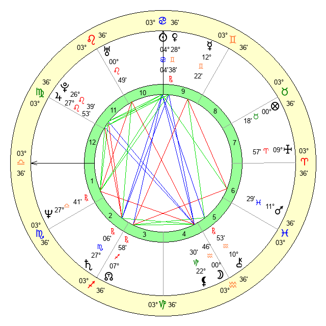| Sun | 4 Cancer 4 | 4 Cancer 23 | 10 Virgo 10 |
