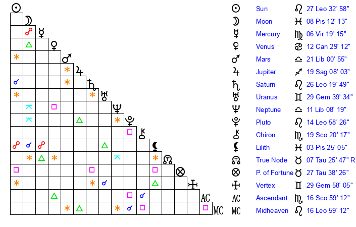 | Pluto | 14 Leo 58 | 1 Aquarius 58 | 16 Leo 31 |
