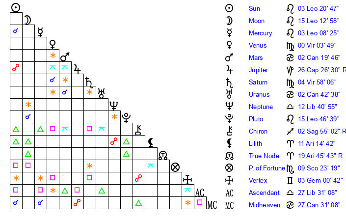 | Moon | 15 Leo 12 | 27 Leo 48 | 26 Taurus 0 |