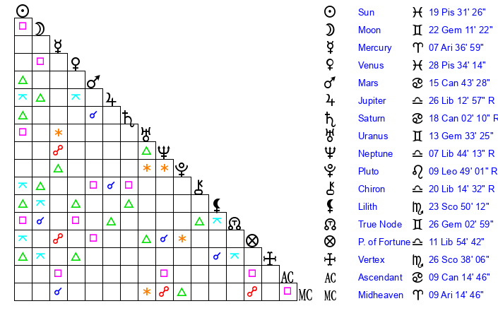 | Sun | 19 Pisces 32 | 20 Pisces 22 | 6 Gemini 45 |