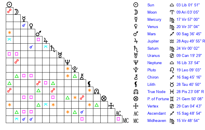 | Saturn | 24 Virgo 28 | 27 Pisces 58 | 1 Libra 55 |