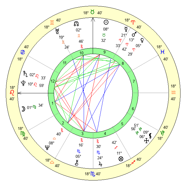 | Moon | 1 Virgo 39 | 6 Gemini 33 | 2 Cancer 23 |