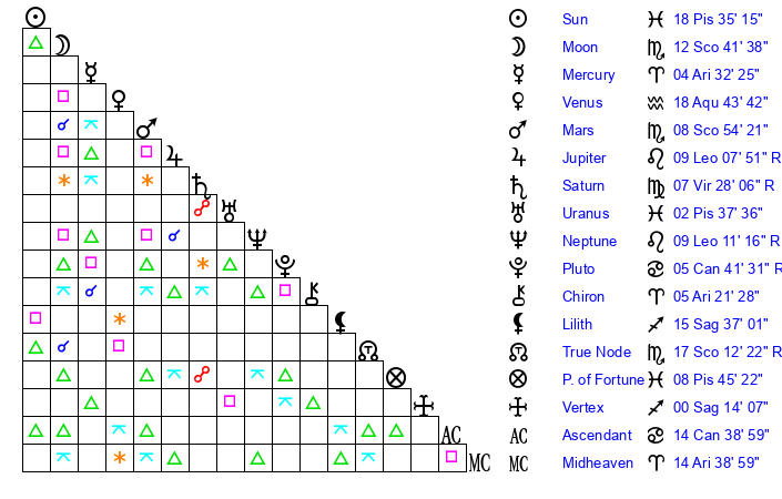 | Moon | 12 Scorpio 37 | 23 Cancer 32 | 20 Virgo 48 |