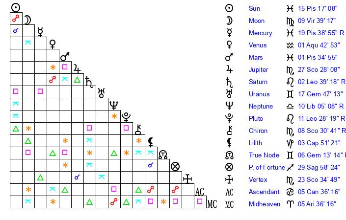 | Moon | 9 Virgo 45 | 16 Gemini 40 | 15 Cancer 11 |