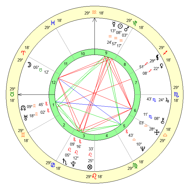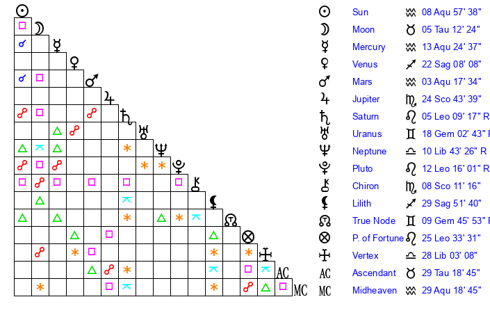 | Moon | 5 Taurus 18 | 12 Aquarius 20 | 13 Pisces 12 |