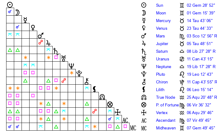 | Moon | 1 Gemini 7 | 14 Aries 51 | 26 Capricorn 22 |