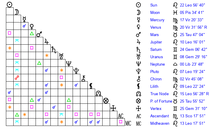 | Sun | 22 Leo 57 | 24 Leo 5 | 13 Scorpio 25 |