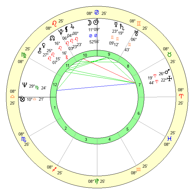 | Moon | 11 Cancer 47 | 9 Libra 59 | 14 Cancer 34 |