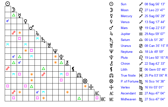 | Sun | 8 Sagittarius 56 | 9 Sagittarius 45 | 25 Aquarius 12 |