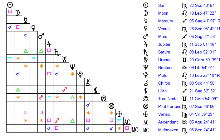 | Venus | 26 Scorpio 5 | 10 Scorpio 59 | 26 Sagittarius 16 |