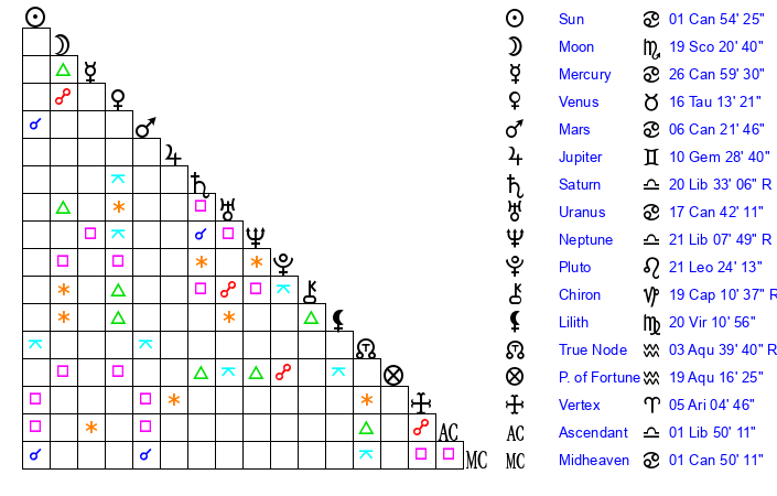 | Moon | 19 Scorpio 16 | 8 Gemini 40 | 19 Cancer 38 |