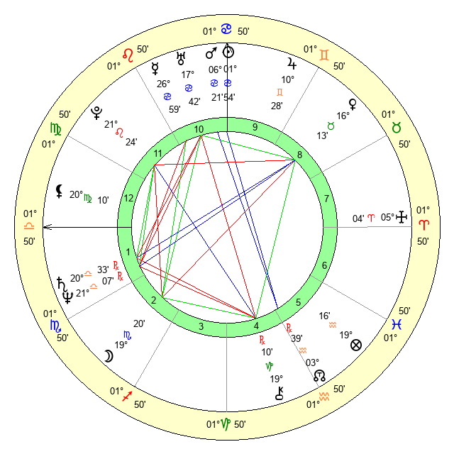 | Sun | 1 Cancer 54 | 2 Cancer 29 | 10 Virgo 52 |