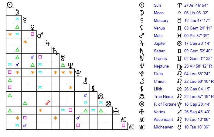 | Sun | 27 Aries 47 | 28 Aries 54 | 16 Cancer 36 |