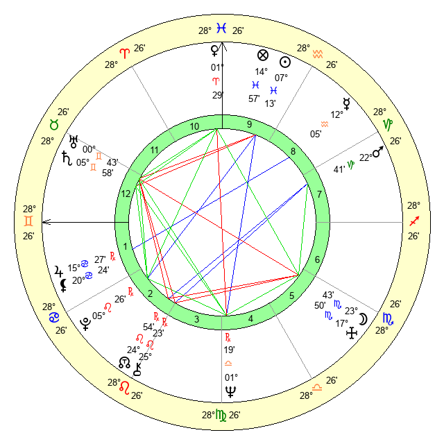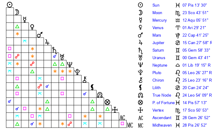 | Moon | 23 Scorpio 43 | 20 Aquarius 31 | 25 Scorpio 28 |