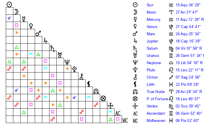 | Sun | 15 Aquarius 34 | 16 Aquarius 8 | 1 Taurus 15 |