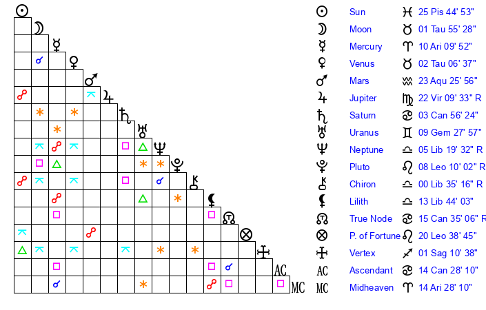 | Sun | 25 Pisces 45 | 26 Pisces 21 | 13 Gemini 41 |