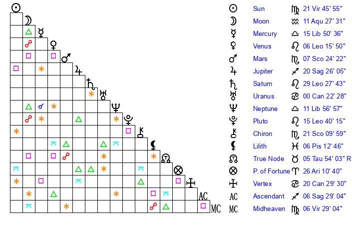 | Saturn | 29 Leo 54 | 28 Pisces 53 | 6 Virgo 26 |