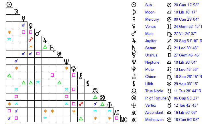| Moon | 10 Libra 19 | 12 Aquarius 59 | 23 Cancer 38 |