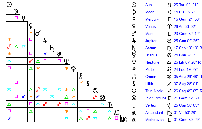 | Moon | 14 Pisces 44 | 10 Capricorn 50 | 21 Libra 19 |