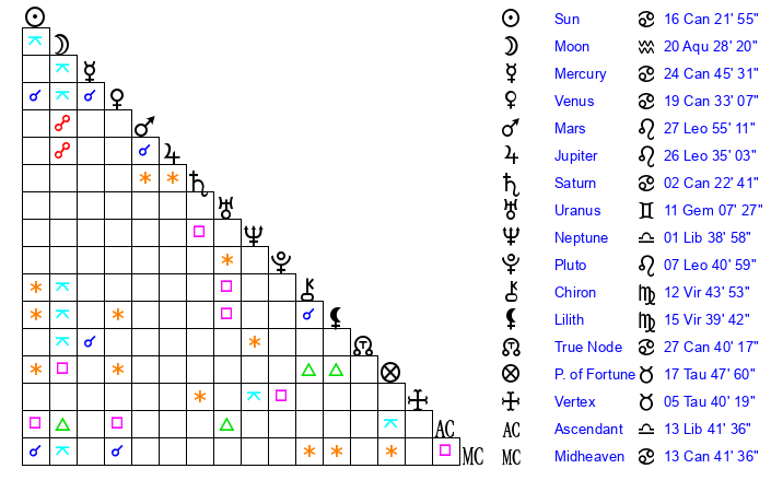 | Venus | 19 Cancer 34 | 4 Gemini 30 | 29 Libra 20 |