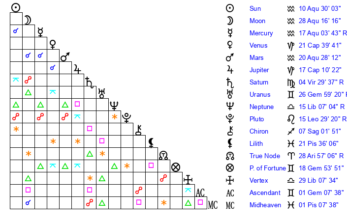 | Moon | 28 Aquarius 13 | 26 Aquarius 25 | 14 Sagittarius 29 |