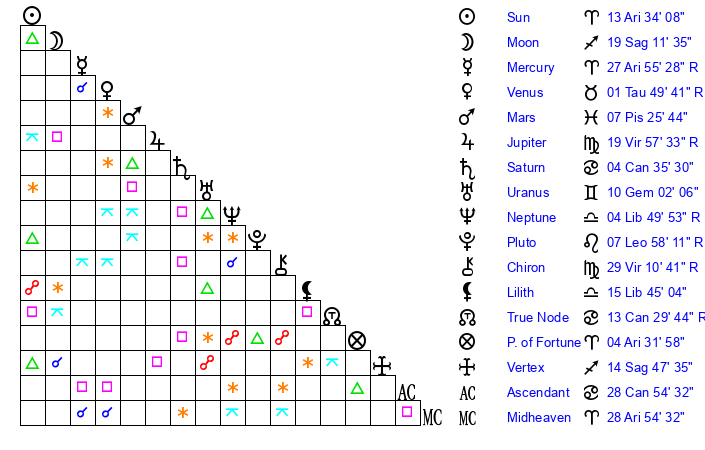 | Moon | 19 Sagittarius 6 | 26 Gemini 40 | 27 Scorpio 15 |