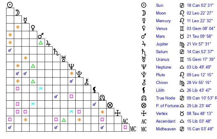 | Sun | 18 Cancer 3 | 18 Cancer 41 | 5 Libra 12 |