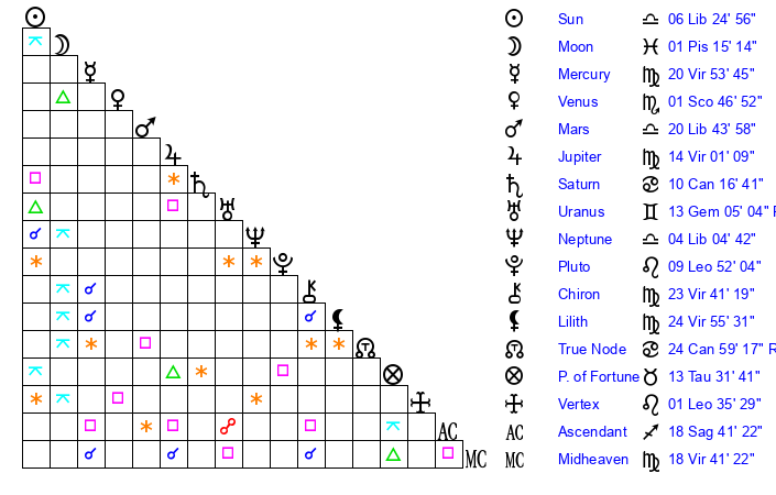 | Neptune | 4 Libra 6 | 0 Aries 34 | 6 Libra 20 |