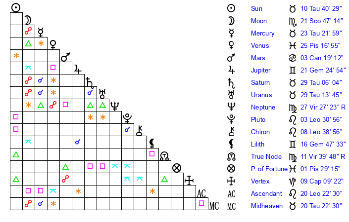 | Sun | 10 Taurus 41 | 11 Taurus 34 | 0 Leo 11 |