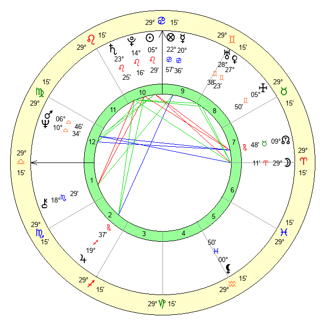 | Moon | 29 Aries 3 | 23 Virgo 28 | 2 Pisces 2 |