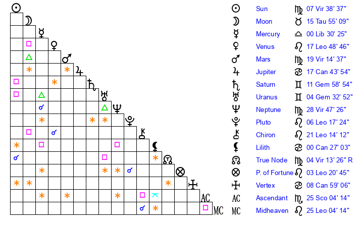 | Moon | 16 Taurus 3 | 13 Sagittarius 23 | 28 Taurus 6 |